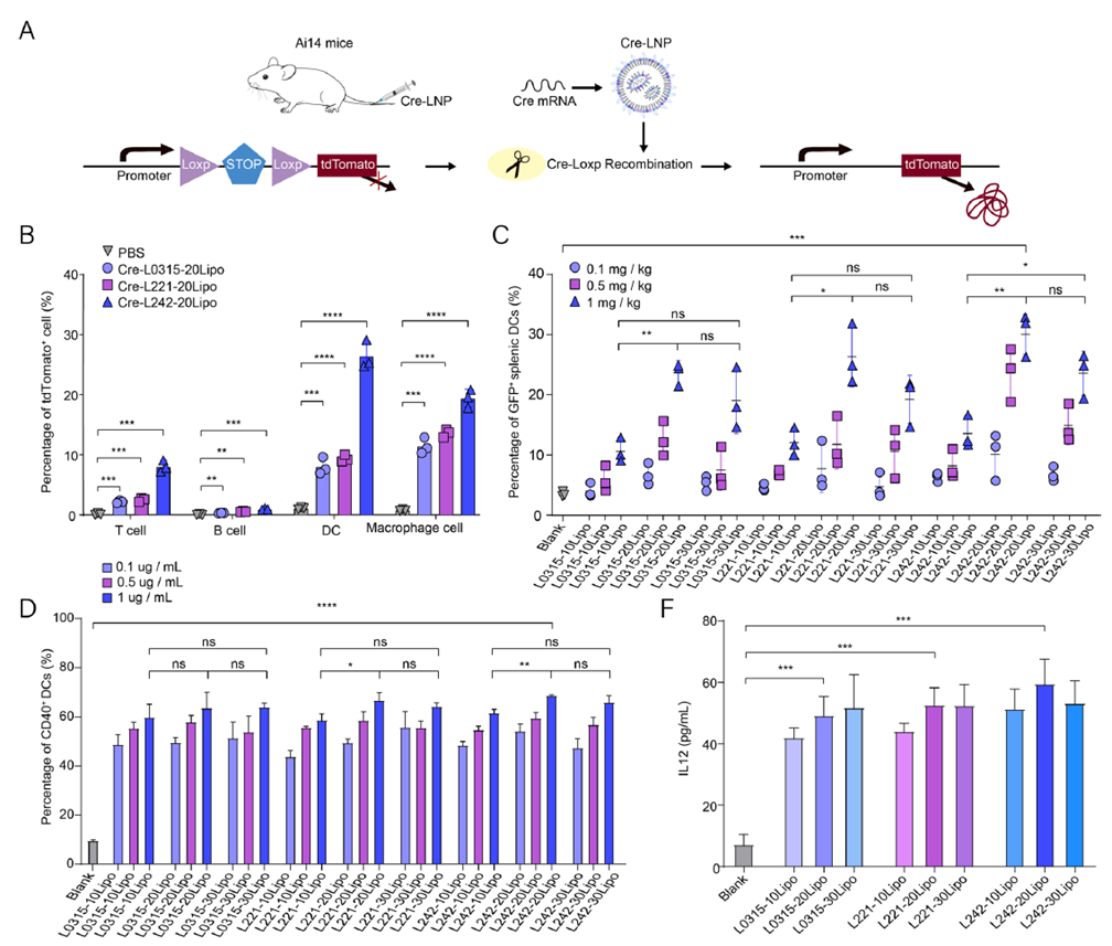 為評估脾靶向LNPs對樹突狀細(xì)胞(DCs)的效應(yīng),研究在Ai14報告小鼠中遞送編碼Cre重組酶的mRNA,通過tdTomato表達追蹤轉(zhuǎn)染細(xì)胞亞群。結(jié)果顯示,Cre-L242-20Lipo在DCs中的攝取率達27%,較對照L0315-20Lipo高3.4倍,且劑量依賴性GFP mRNA遞送進一步證實其DCs靶向優(yōu)勢。隨后,遞送neoantigen mRNA(Hepa-M01-mRNA)后,DCs中CD40和CD86表達分別提升7.5倍和5.7倍,ELISA檢測顯示IL-12和TNF-α分泌顯著增加。這一系列結(jié)果表明,L242-20Lipo高效促進DCs的抗原攝取和激活,為neoantigen疫苗誘導(dǎo)強效免疫應(yīng)答奠定了基礎(chǔ)。