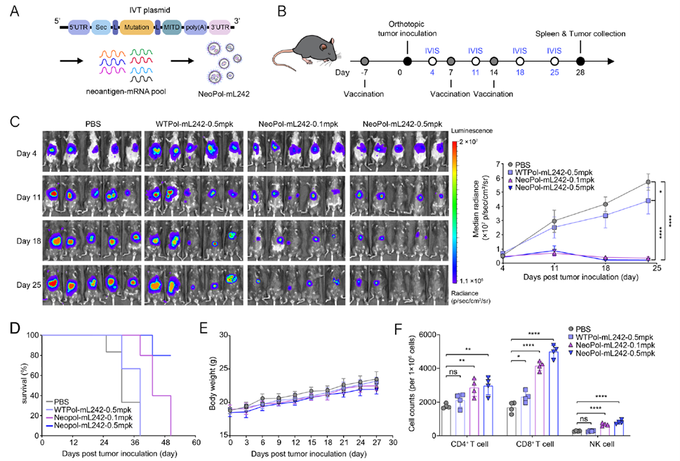 為了在原位HCC模型中評估NeoPol-mL242的抗腫瘤免疫,研究團隊將NeoPol設(shè)計為包含Hepa-M01至M07的七個neoantigens,小鼠接受三次疫苗接種,通過體內(nèi)成像系統(tǒng)監(jiān)測腫瘤進展,結(jié)果顯示NeoPol-mL242組腫瘤負(fù)擔(dān)較對照組降低約90%,0.5 mg/kg組展現(xiàn)顯著生存延長和體重穩(wěn)定;進一步檢測發(fā)現(xiàn)疫苗治療組腫瘤中CD8+ T細(xì)胞浸潤水平更高,Ki67和TUNEL測定顯示腫瘤細(xì)胞增殖能力顯著下降、凋亡率升高,這些發(fā)現(xiàn)表明NeoPol-mL242有效激活抗腫瘤免疫,抑制HCC生長。
