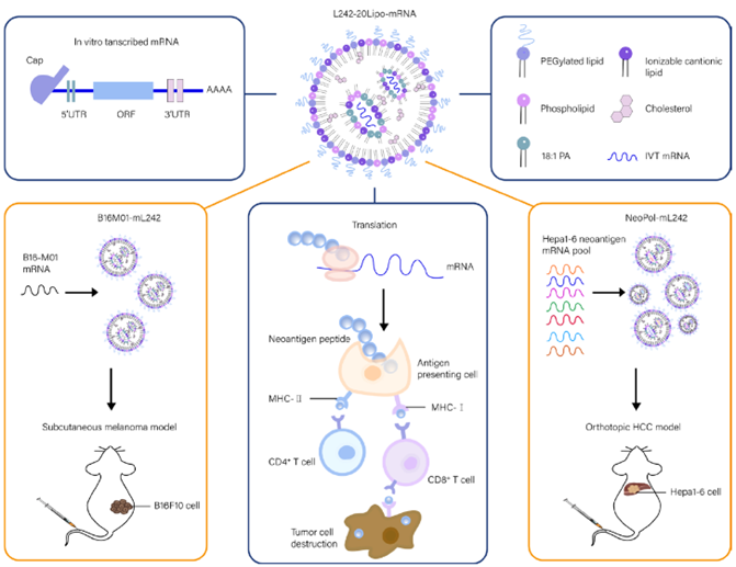 此研究聚焦于脾靶向NeoPol-mL242 mRNA疫苗在肝細(xì)胞癌(HCC)模型中的應(yīng)用,通過優(yōu)化L242-20Lipo遞送系統(tǒng)實現(xiàn)了高效的脾選擇性mRNA遞送與DCs激活,顯著減少肝毒性。在黑色素瘤和HCC模型中,疫苗成功誘導(dǎo)強效T細(xì)胞應(yīng)答,有效抑制腫瘤生長并延長生存,展現(xiàn)了其在癌癥免疫療法中的突出潛力。