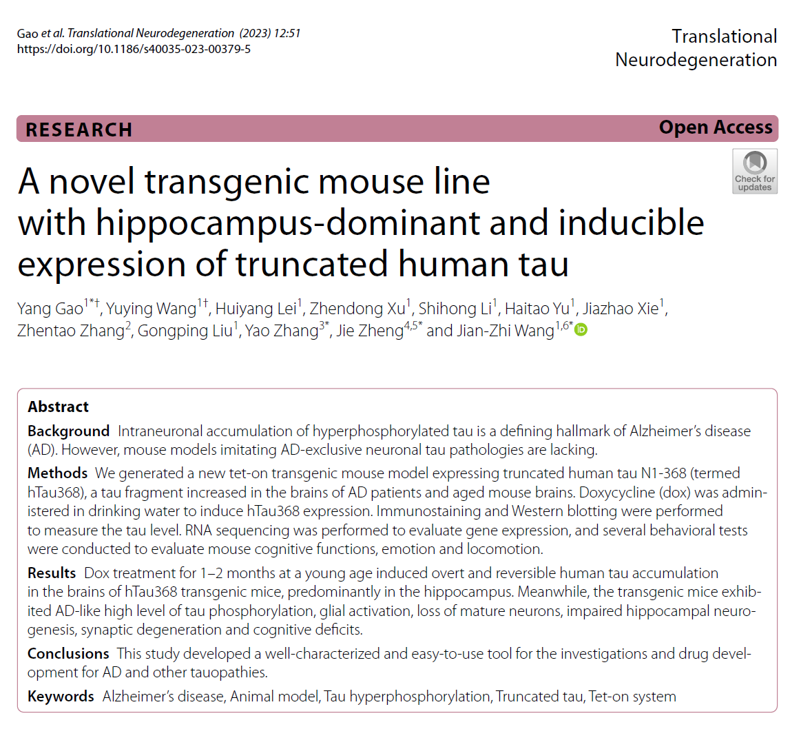 阿爾茨海默病(Alzheimer’s disease, AD)是老年人中最常見的神經退行性疾病,其主要特征是神經元內高度磷酸化的tau蛋白異常積累,導致神經纖維纏結(NFTs)形成并引發認知功能衰退。研究發現,截短的tau片段(如N1-368)在AD患者及老年小鼠腦中顯著增加,促進了tau病理的進展。為模擬AD特異性tau病理,研究者開發了一種新型tet-on轉基因小鼠模型(hTau368),可誘導表達截短的人類tau N1-368,引發海馬區主導的tau積累、磷酸化、神經元丟失及認知障礙。