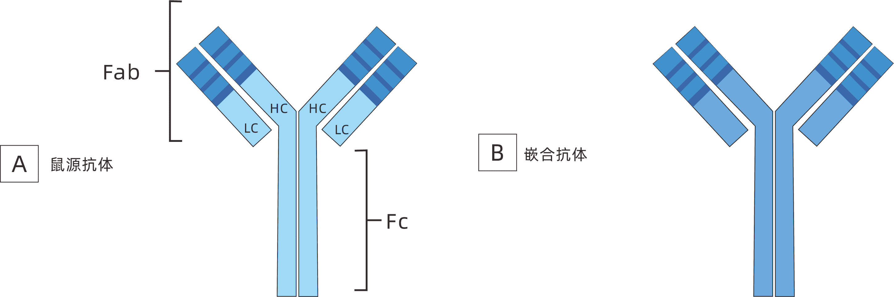 嵌合抗體是指將一個物種的抗體恒定區更換為另一個物種的。最早使用此技術的是1984年Morrison等人將鼠單抗可變區與人IgG恒定區在基因水平上連接在一起,成功構建了第一代人-鼠嵌合抗體。嵌合抗體成功的例子:Rituxan(中文名美羅華),羅氏公司的抗CD20抗體,用于治療B淋巴瘤,含人IgG1恒定區。它的抗淋巴瘤作用主要來自于補體作用、ADCC作用。2015年此單一產品的銷售額達到70億美元。